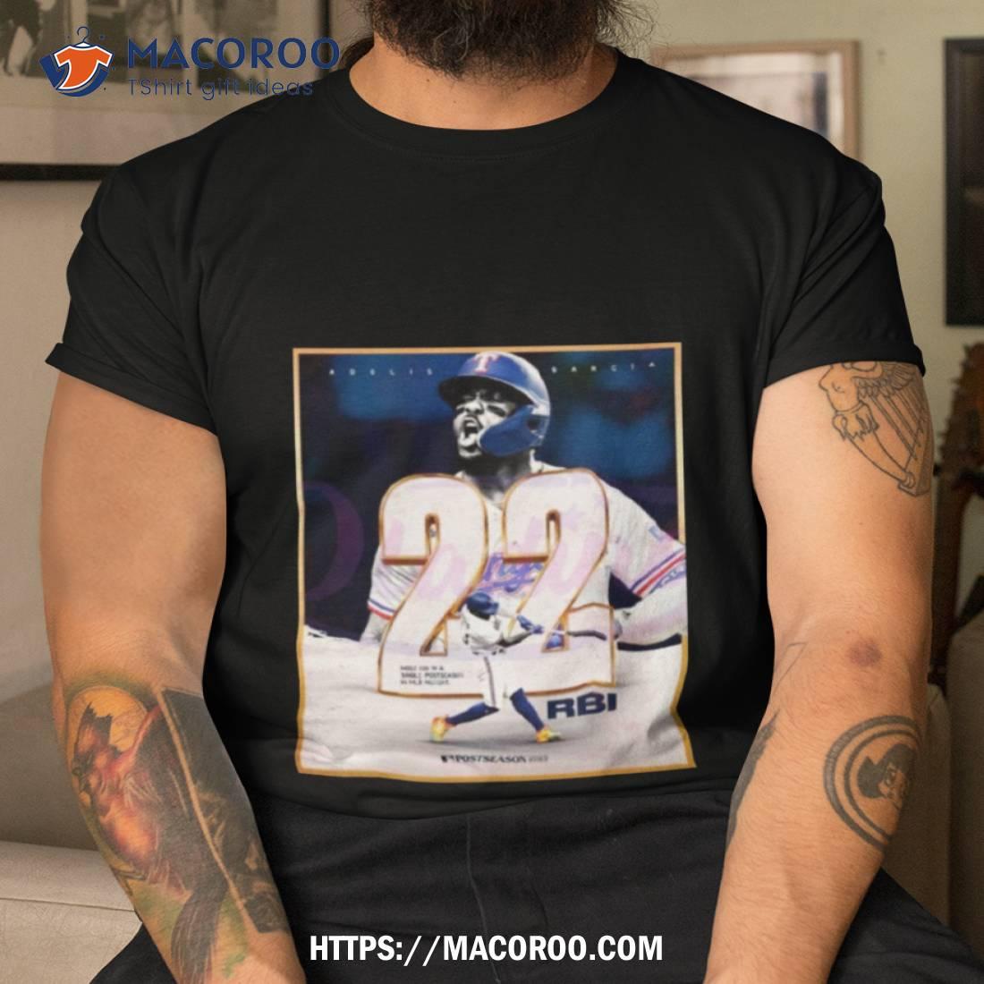 A must-have for any Adolis Garcia fan! This t-shirt celebrates his record-breaking postseason performance. Great quality and design. Highly recommended!