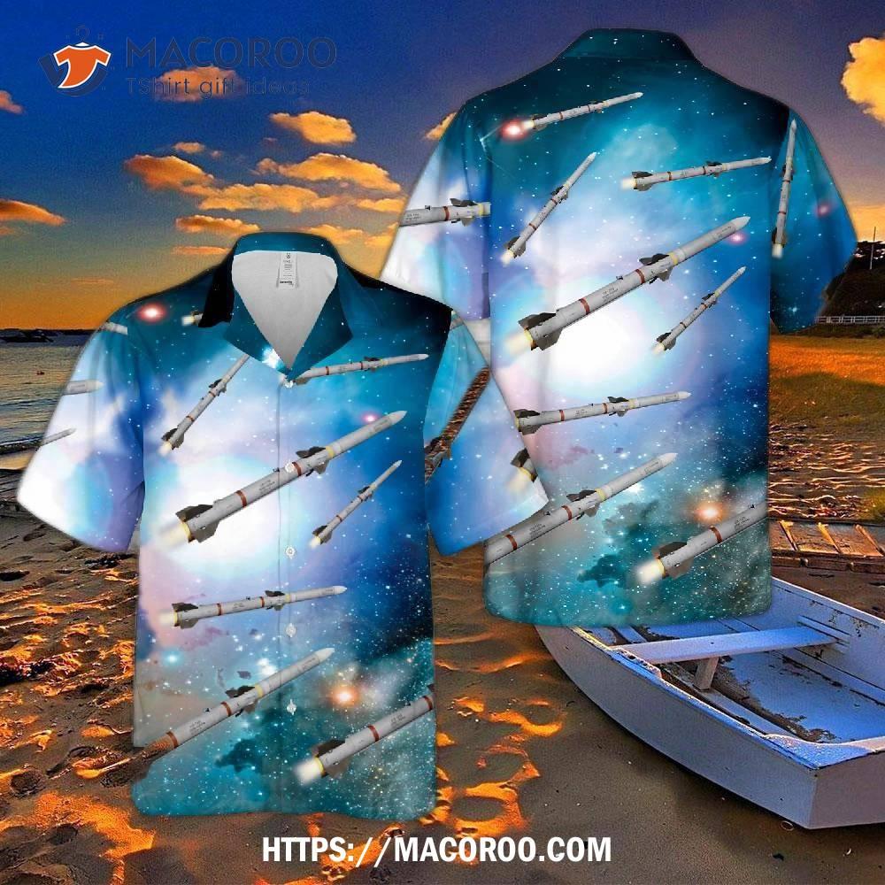 Fun and stylish Hawaiian shirt with an Aim-120 Amraam air to missile design. Great for any fan of military aircraft.