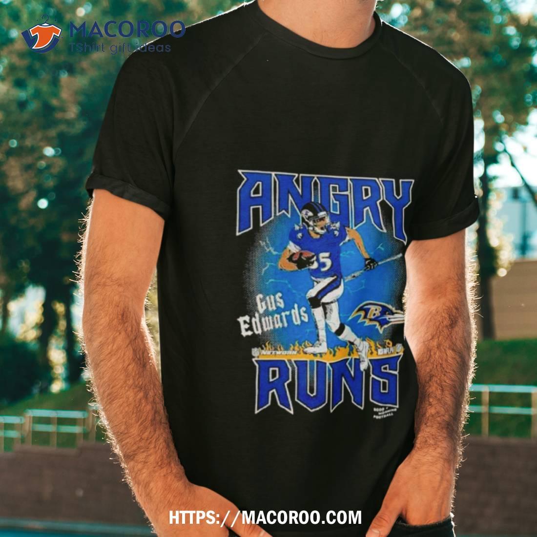 This shirt is perfect for Ravens fans! It features Gus Edwards and the Angry Runs logo. Great quality and stylish design!