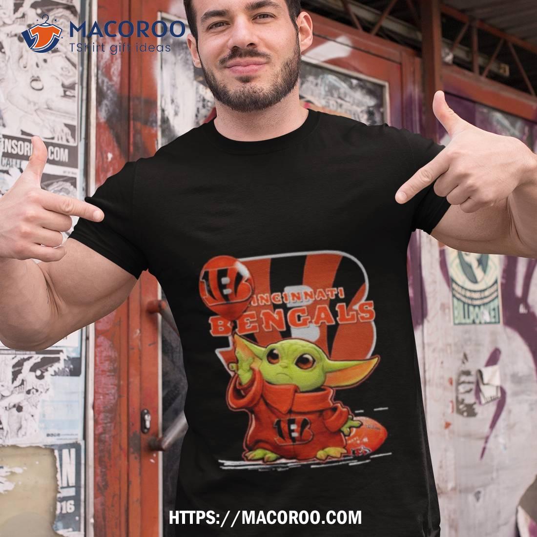 Cute and comfy Baby Yoda t-shirt featuring the Cincinnati Bengals logo. Perfect for any fan of the team!