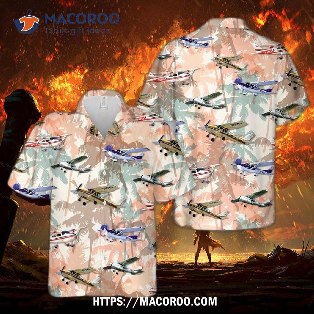 Fun, bright Hawaiian shirt with Cessna 182 Skylane design – perfect for any aviation enthusiast!