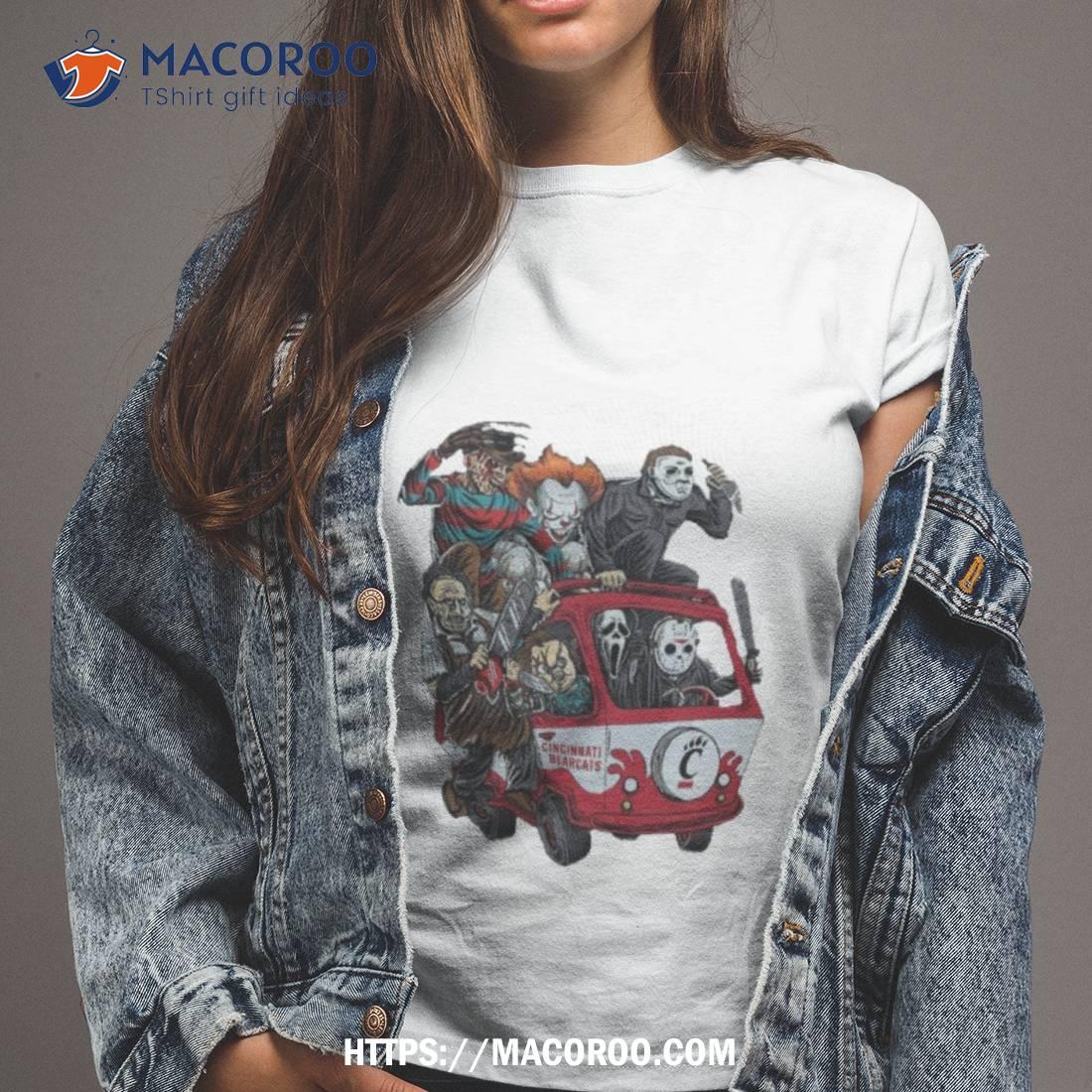 This shirt is perfect for any Cincinnati Bearcats fan who loves horror movies. The characters, bus, and Halloween 2023 design make it a great addition to any wardrobe.