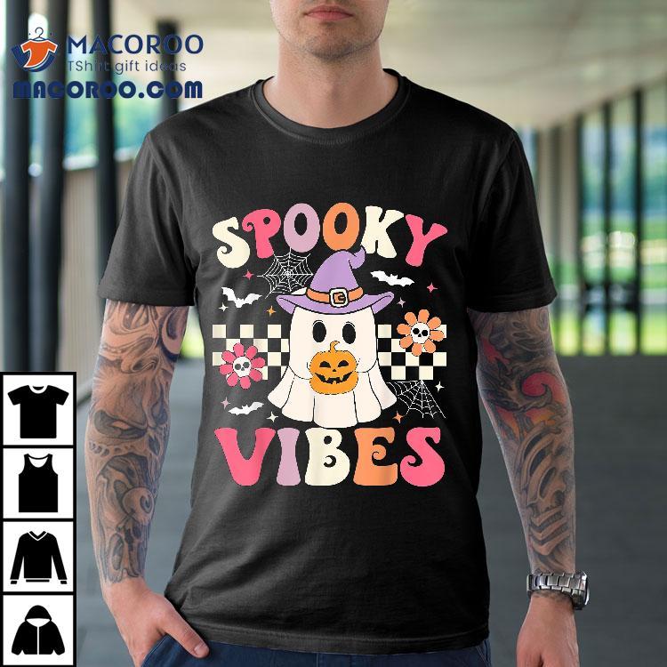 Groovy Spooky Vibes Retro Ghost Holding Pumpkin Halloween Shirt