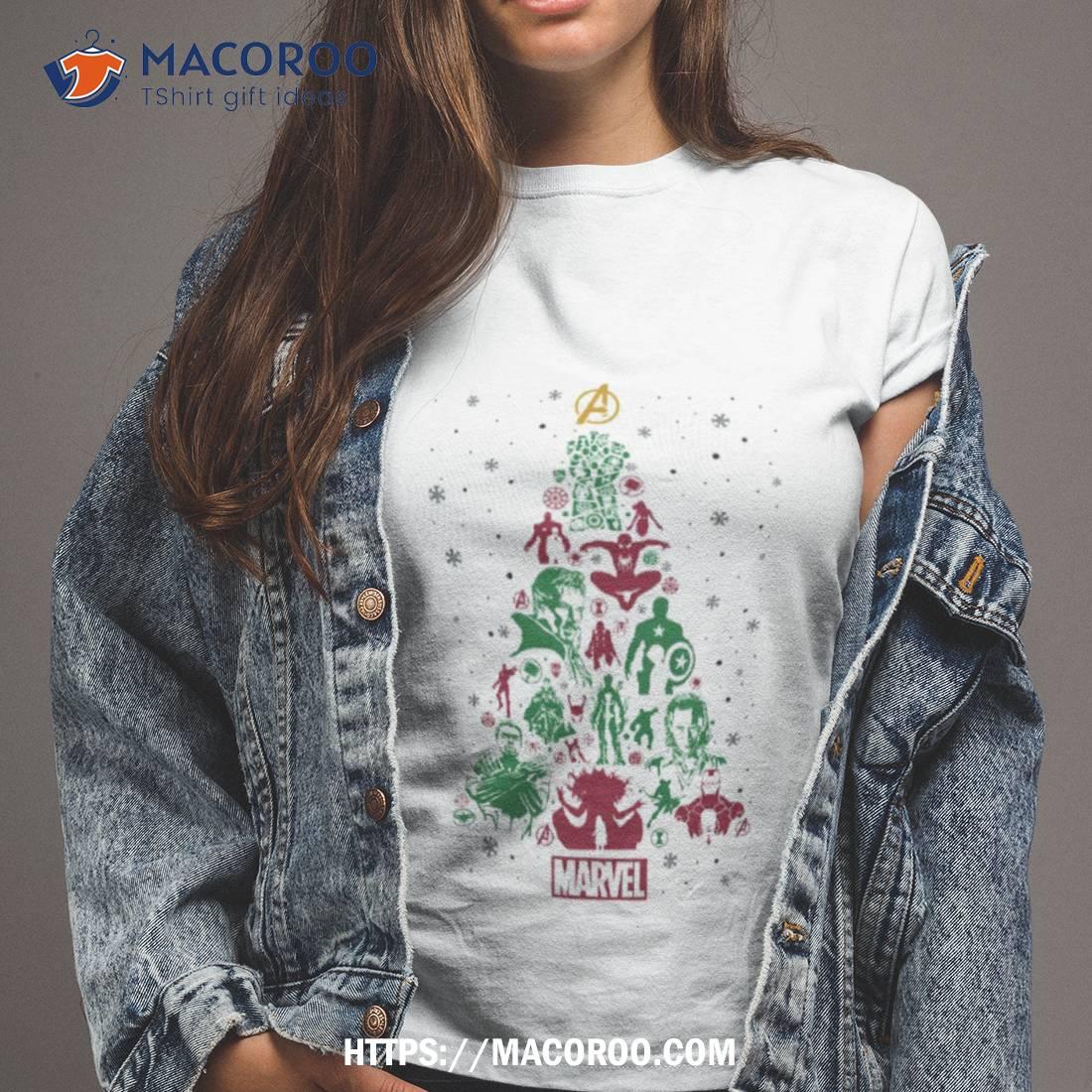 Fun and festive Marvel Christmas Tree Avengers shirt! Perfect for any Avenger fan.
