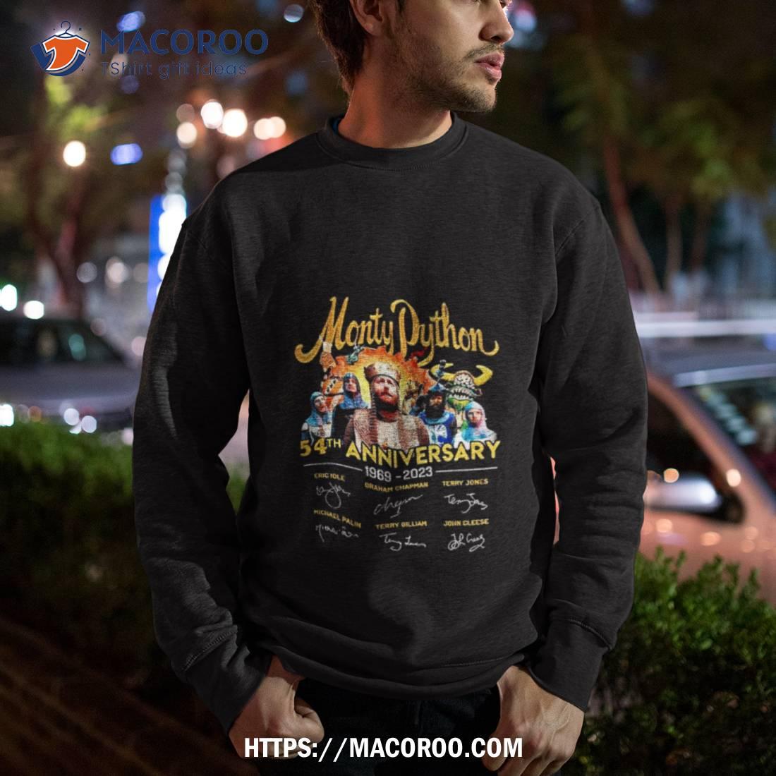 A must-have for Monty Python fans! This shirt celebrates the 54th anniversary of the iconic comedy group, featuring signatures from Eric Idle, Graham Chapman, Terry Jones, Michael Palin, Terry Gilliam and John Cleese.