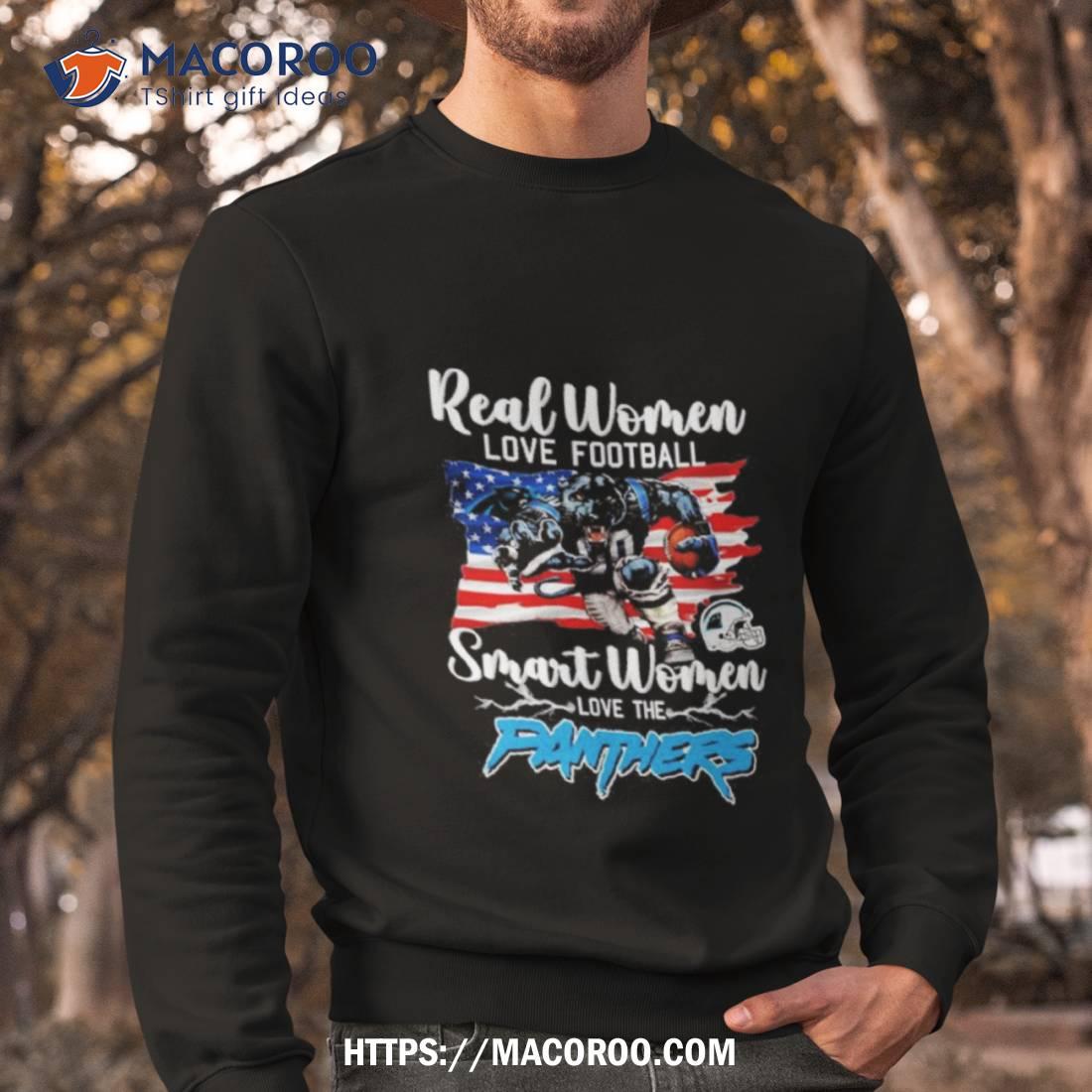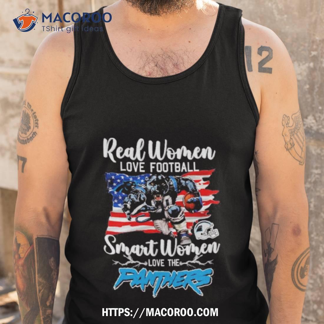 This NFL Real Women Love Football Smart Women Love The Carolina Panthers Mascot America Flag T Shirt is a great way to show your team spirit. It’s stylish and comfortable, making it perfect for any occasion. The bold colors and graphics make it stand out in a crowd. A great addition to any fan’s wardrobe!