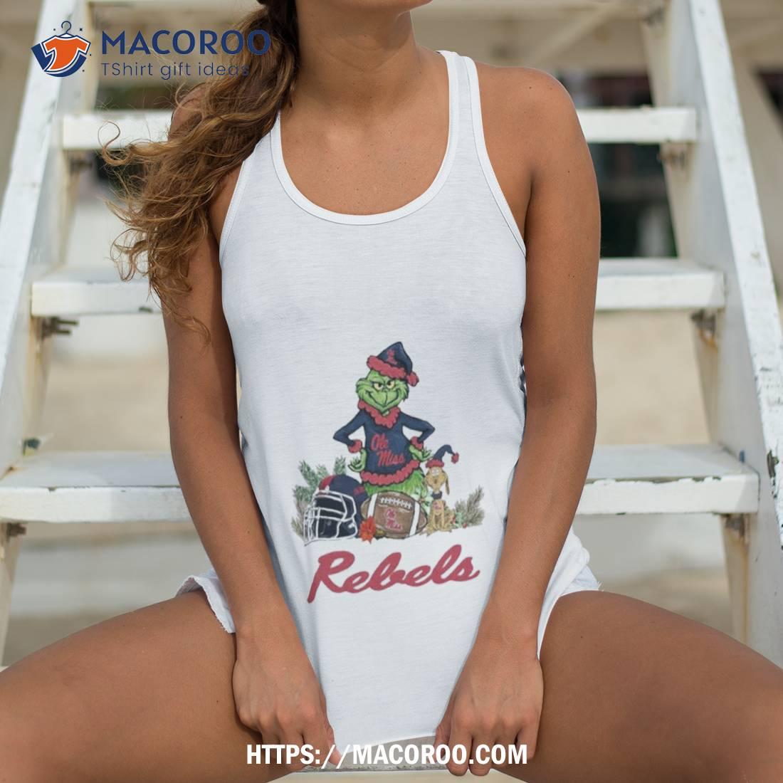Adorable Christmas shirt featuring the Ole Miss Rebels mascot and Grinch! Perfect for any fan of the team.