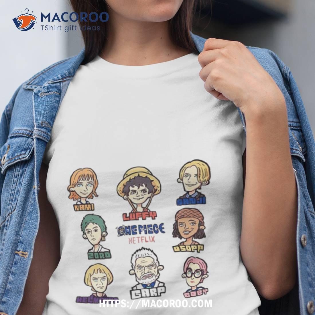 One Piece fans will love this Netflix Live Action sticker shirt! Great gift for any fan.