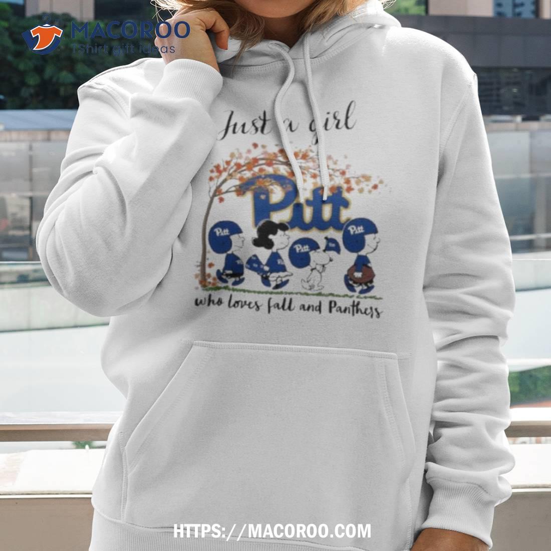 This shirt is perfect for any Pittsburgh Panthers fan! It features a cute peanuts cartoon and a fall-themed Panthers logo. A great way to show your team spirit!