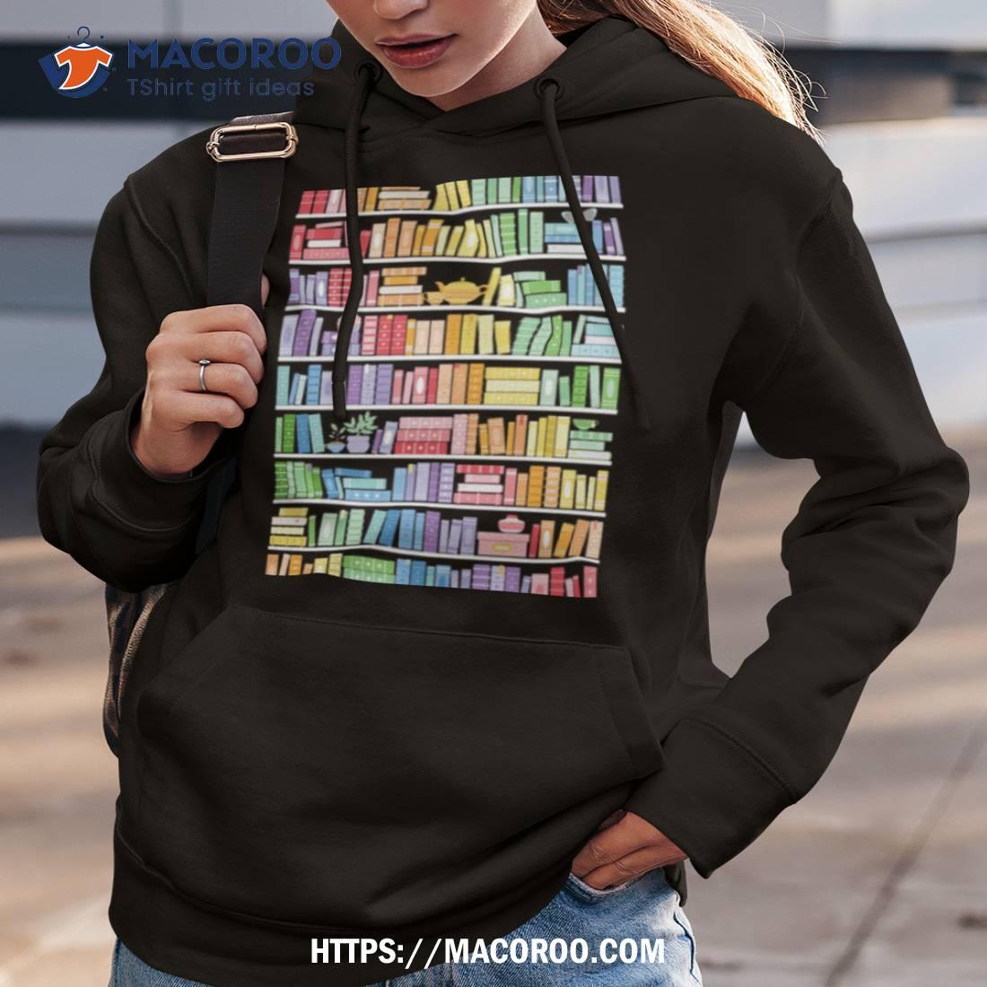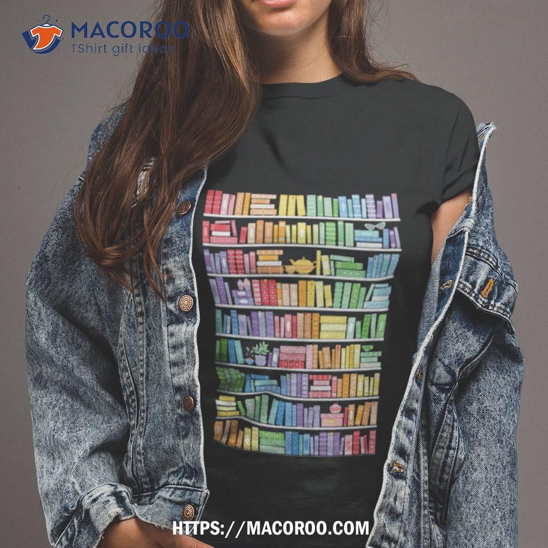 A fun and unique shirt with a rainbow bookshelf pattern. Perfect for book lovers!